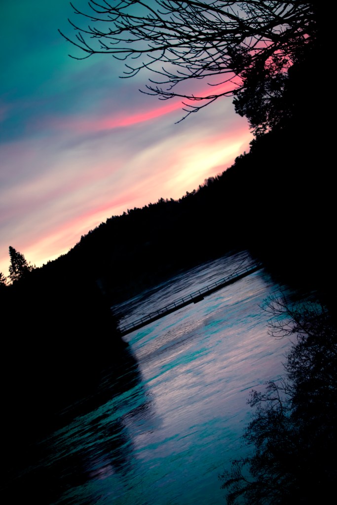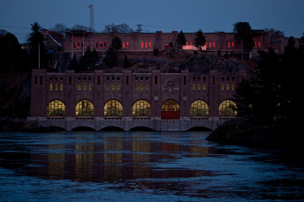 1. Bilderna är tagna samtidigt men i olika väderstreck. De gult lysande valvfönstren är ljus inifrån vattenkraftverket Olidan och tittar man noga så ser man de stora gröna turbinerna därinne. Tack för din feedback!